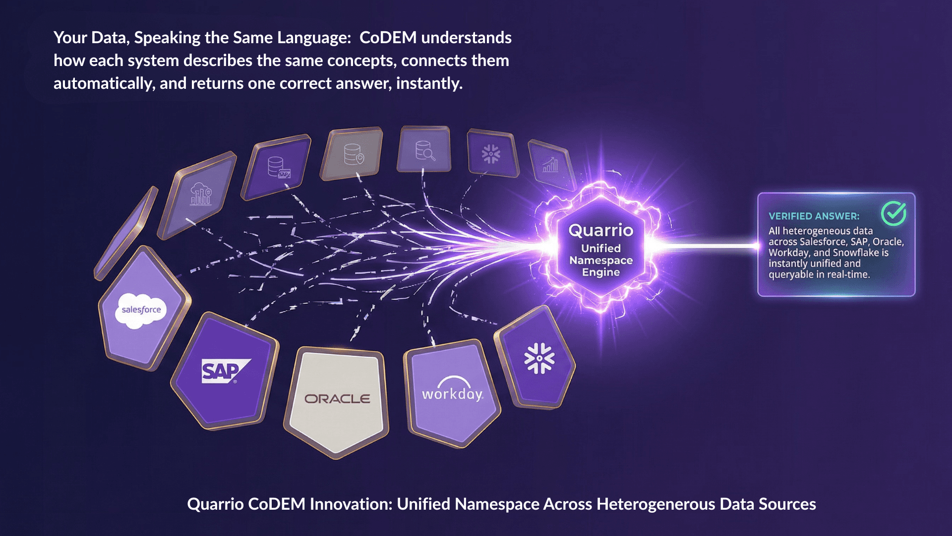 CoDEM eliminates that bottleneck through what Quarrio calls a Unified Namespace, another core innovation. The system understands how each of your data sources describes the same concepts and entities. It then connects them automatically, querying all relevant systems at once and returning a single, coherent, correct answer in seconds.