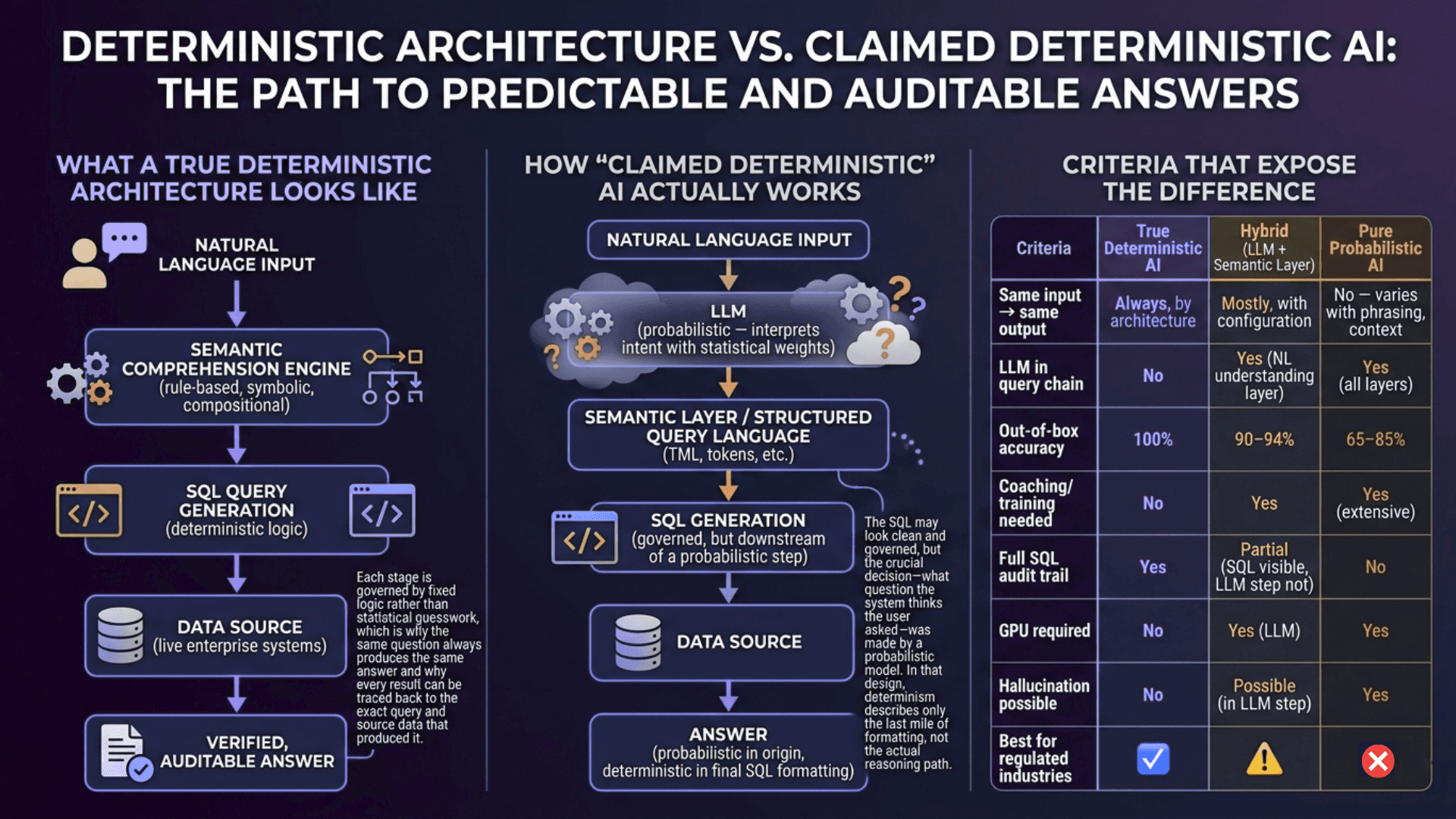 Criteria | True Deterministic AI | Hybrid (LLM + Semantic Layer) | Pure Probabilistic AI |
