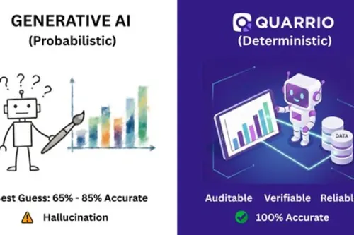 Unlike probability-driven GenAI, Quarrio's architecture translates natural language into verified database queries against structured enterprise systems such as CRM, ERP, financial systems, and risk databases. Deterministic AI provides full query transparency and consistency: